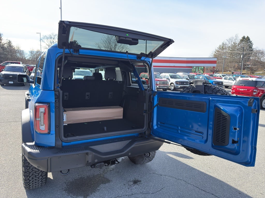 Equipment Group 332A Mid Package: 17" Carbonized Gray-Painted Aluminum Wheel; Rear Parking Sensors; Power Outlet - Back Side of Center Floor Console; Dual Smart Charging USB Ports; Front Row Heated Seats; Driver and Front Passenger Illuminated Sliding Visor Vanity Mirrors; AM/FM Stereo; Dual-Zone Electronic Automatic Temperature Control; Connected Navigation; LT285/70R17 A/T Tires; Ambient Footwell Lighting; Remote Start System; 2-Door Intelligent Access with Lock/unlock. Ford Co-Pilot360: Auto High-Beam Headlamps; Rear View Camera; Pre-Collision Assist with Automatic Emergency Braking; Blind Spot Information System (BLIS); Lane-Keeping System. Body Color-Painted Hard Top. Leather-Trimmed/vinyl Bucket Seats. Ford Performance Heavy-Duty Modular Front Bumper. Trailer Tow Package. Hard Top Sound Deadening Headliner. Velocity Blue Metallic. Front and Rear Floor Liners Without Carpet Floor Mats. Bronco 66 33" Spare Tire Cover. **Equipment listed is based on original vehicle build and subject to change. Please confirm the accuracy of the included equipment by calling the dealer prior to purchase.**