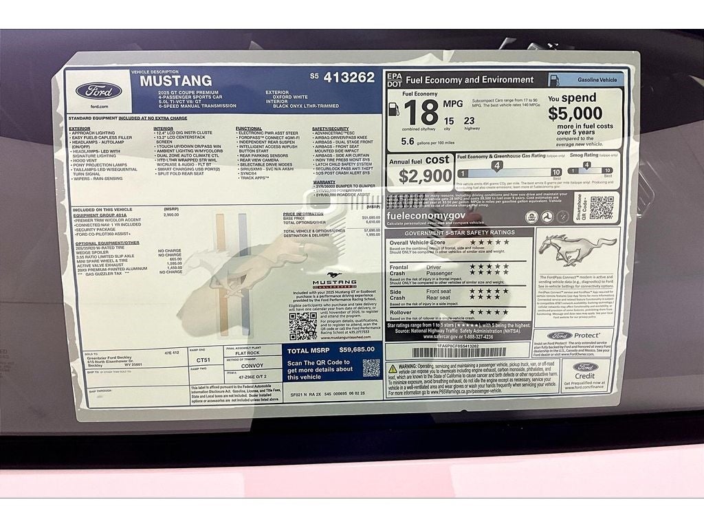 Equipment Group 401A High Package: Illuminated Door-Sill Scuff Plates; 5.0L Ti-VCT V8 Engine; 6-Speed Manual Transmission; AM/FM Stereo; Driver Seat and Mirrors Memory. Ford Co-Pilot360 Assist+: Adaptive Cruise Control with Stop and Go; Connected Navigation; Pre-Collision Assist with Automatic Emergency Braking; Lane-Keeping System with Lane Keeping Aid. Security Package: Active Anti-Theft System; Locking Center Console; Wheel Locking Kit. Premier Trim with Color Accent Group: Instrument Panel with Accent Stitch. Active Valve Performance Exhaust. 20" X 9" Premium-Painted Aluminum Wheels. 3.55 Limited Slip Rear Axle. Mini Spare Wheel and Tire. **Equipment listed is based on original vehicle build and subject to change. Please confirm the accuracy of the included equipment by calling the dealer prior to purchase.**Equipment Group 401A High Package: Illuminated Door-Sill Scuff Plates; 5.0L Ti-VCT V8 Engine; 6-Speed Manual Transmission; AM/FM Stereo; Driver Seat and Mirrors Memory Ford Co-Pilot360 Assist+: Adaptive Cruise Control with Stop and Go; Connected Navigation; Pre-Collision Assist with Automatic Emergency Braking; Lane-Keeping System with Lane Keeping Aid Security Package: Active Anti-Theft System; Locking Center Console; Wheel Locking Kit Premier Trim with Color Accent Group: Instrument Panel with Accent Stitch Active Valve Performance Exhaust 20" X 9" Premium-Painted Aluminum Wheels 3.55 Limited Slip Rear Axle Mini Spare Wheel and Tire **Equipment listed is based on original vehicle build and subject to change. Please confirm the accuracy of the included equipment by calling the dealer prior to purchase.**