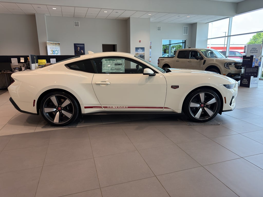 Equipment Group 401A High Package: Illuminated Door-Sill Scuff Plates; 5.0L Ti-VCT V8 Engine; 19" X 8.5" Shadow Silver-Painted Aluminum; 19" Tires; AM/FM Stereo; Driver Seat and Mirrors Memory. Ford Co-Pilot360 Assist+: Adaptive Cruise Control with Stop and Go; Connected Navigation; Pre-Collision Assist with Automatic Emergency Braking; Lane-Keeping System with Lane Keeping Aid. Security Package: Active Anti-Theft System; Locking Center Console; Wheel Locking Kit. 60th Anniversary Package: Anniversary Special Edition Badge; Silver Painted Mirror Caps; Painted High Gloss Black Honeycomb Grille; Headlamps with Black Bezels; Spoiler Delete. Premier Trim with Color Accent Group: Instrument Panel with Accent Stitch. Brembo Brake System with Performance Linings. Active Valve Performance Exhaust. 3.55 Limited Slip Rear Axle. B&O Sound System by Bang & Olufsen with 12 Speakers. Wimbledon White. Red Full Indoor Vehicle Cover. Carpeted Floor Mats - Left Side Front/rear with Logo. First Aid Kit. **Equipment listed is based on original vehicle build and subject to change. Please confirm the accuracy of the included equipment by calling the dealer prior to purchase.**